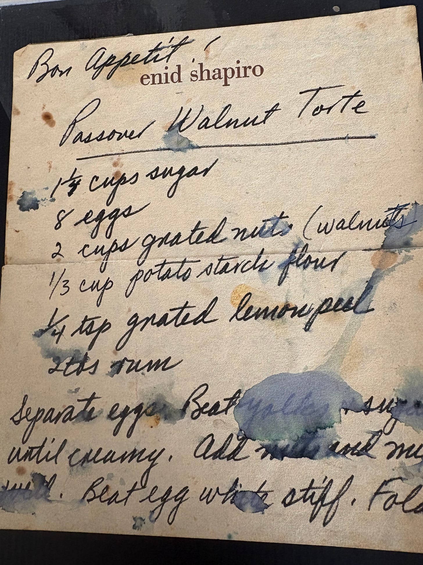 Today, recipes are digital documents, put into computer files, emailed to one another or downloaded from internet sites. Not these recipes. My mother’s “Passover Walnut Torte” is written in her handwriting—I would know it anywhere—on fawn-colored stationery. Her name is embossed in script across the top and she added a personal handwritten note: “Bon Appétit.” The page is severely creased, with two blemishes—misshapen water stains like tears—and I treasure them as I would a kiss or caress between us. I can smell her torte baking in a springform pan in the oven of my childhood kitchen.